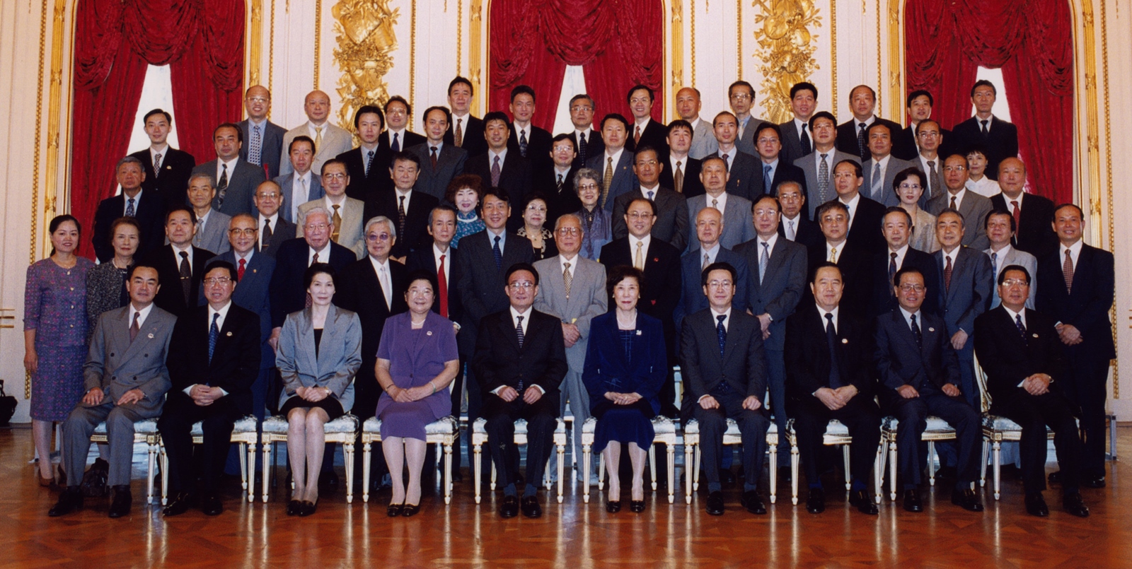 中国僑聯主催の国慶招待会に招かれた在日華僑代表と会見する林兆枢僑聯主席(左5)、2003年9月27日、北京・華僑大厦にて。(拡大写真)